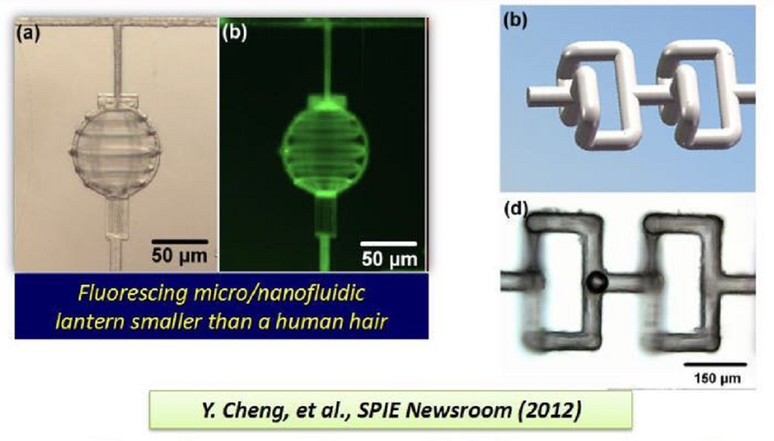 微流控芯片簡介: 通常把在微米尺度空間里流動的流體稱作微流體,操作以層流流動為主要特點的微流體稱為微流控。微流控芯片是微米、百微米甚至毫米尺度下對流體進行精確操控的技術(shù)。具有將生物、化學、醫(yī)學、光學、物理學、力學等實驗室的一些基本功能單元集成到一塊很小面積的芯片上的能力。 微流控芯片技術(shù)的應用: 細胞分析 臨床檢測 化學分析 合成領(lǐng)域 光流體領(lǐng)域 微流控芯片技術(shù)的優(yōu)勢: 微流控芯片具有傳統(tǒng)實驗方法所不具備的一些優(yōu)點,如:超低的試劑消耗、高集成度、高自動化程度、高效率、環(huán)境友好,微型化方便攜帶、低成本及操控簡單等。 微流控芯片加工: 一直以來針對微流控芯片加工常用的方法有光刻加轉(zhuǎn)印法、熱壓法、注塑模成型法、納米壓印以及3D打印技術(shù)等。但針對一些微小復雜的微型結(jié)構(gòu),以上方法并非首選,飛秒激光雙光子加工以其獨特的優(yōu)勢開始走進人們視野。 其主要優(yōu)勢有: 直寫加工,無需掩模,大大減少工藝復雜性 真三維加工 加工分辨率高 可加工材料多樣