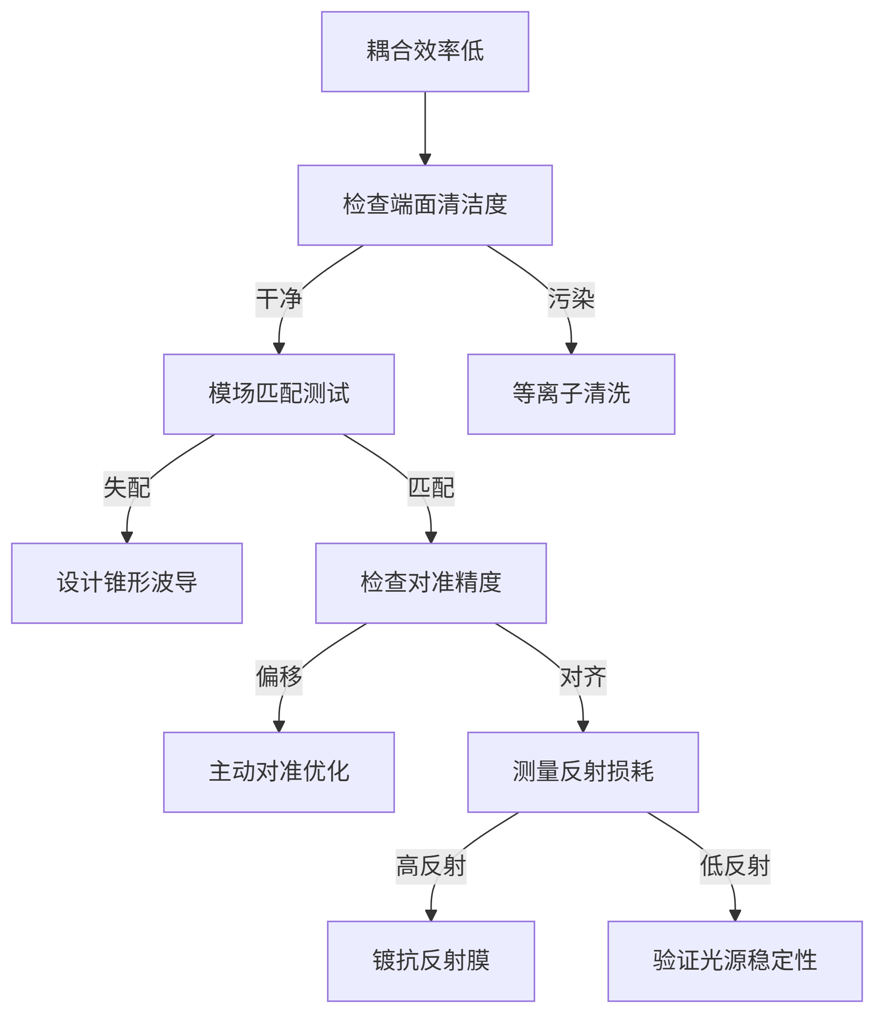 端面污染或損傷 | 1、顯微鏡觀察端面是否有劃痕或顆粒。 2、紅外相機(jī)檢查光斑是否畸變。 | 1、等離子清洗(O?/Ar混合氣體)。 2、重新拋光端面(8°斜角拋光)。 |