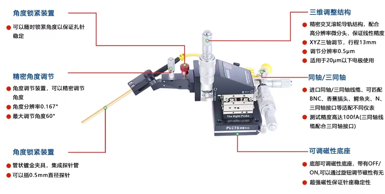 .主體材質(zhì)采用進(jìn)口航空鋁,表面噴砂氧化,優(yōu)質(zhì)的機(jī)械性能; .采用進(jìn)口交叉滾珠導(dǎo)軌,超高穩(wěn)定性; .采用進(jìn)口高分辨率差動微分頭,分辨率高達(dá)0.5μm; . 多功能調(diào)節(jié)夾具,可以實(shí)現(xiàn)180°旋轉(zhuǎn)及60°定向傾斜調(diào)節(jié); .適用于在顯微鏡下定向調(diào)節(jié)探針,無視野遮擋; .底部超強(qiáng)可調(diào)磁性底座,磁性吸附可達(dá)10Kg,保證扎針的穩(wěn)定性; .可選配升級真空吸附,搭配7L/min真空泵。 |
