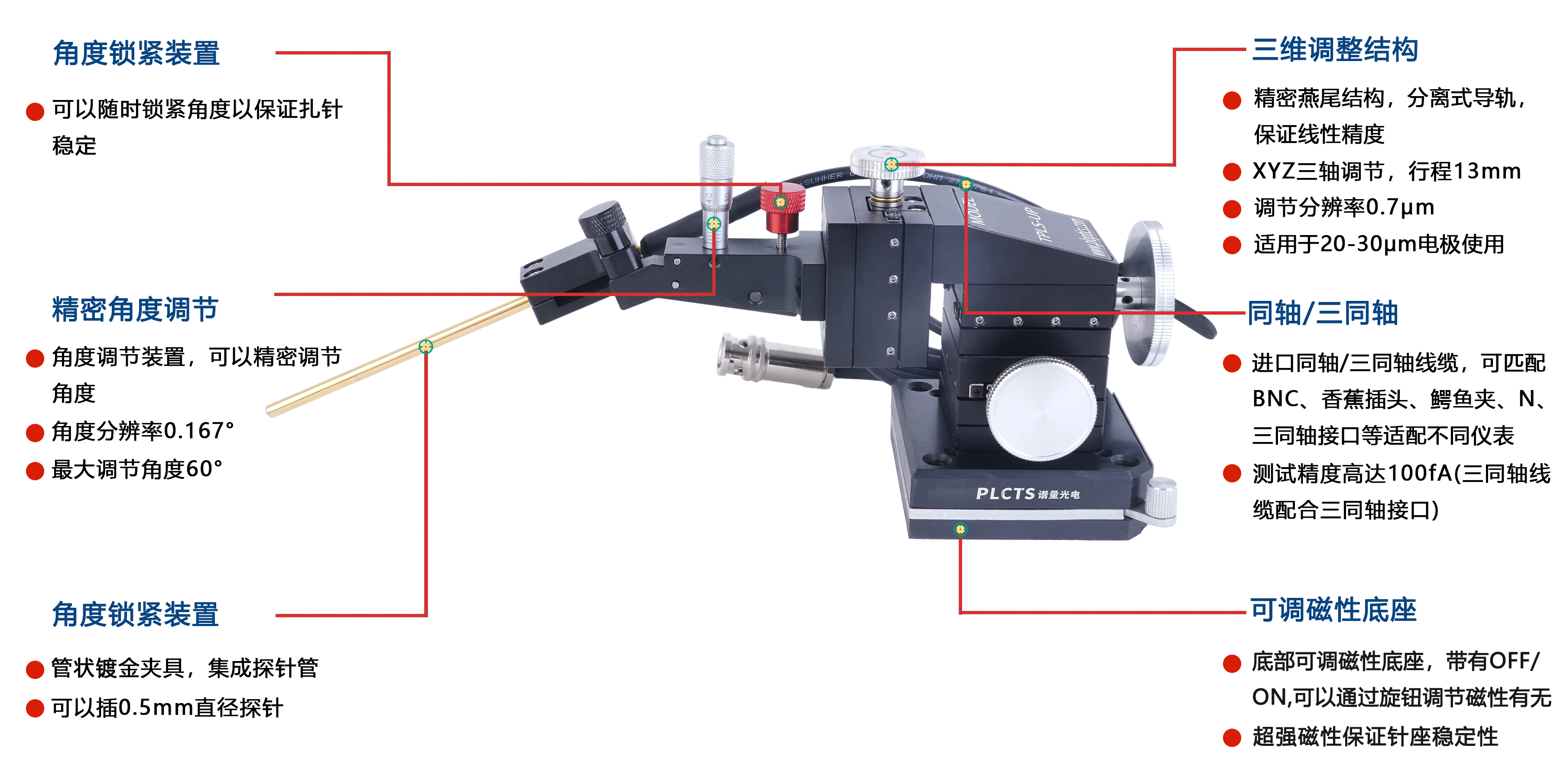 .主體材質(zhì)采用進(jìn)口航空鋁,表面噴砂氧化,優(yōu)異的機(jī)械性能; .采用進(jìn)口交叉滾珠導(dǎo)軌,超高穩(wěn)定性; .采用進(jìn)口高分辨率差動微分頭,分辨率高達(dá)0.7μm; . 多功能調(diào)節(jié)夾具,可以實(shí)現(xiàn)180°旋轉(zhuǎn)及60°定向傾斜調(diào)節(jié); .適用于在顯微鏡下定向調(diào)節(jié)探針,無視野遮擋; .底部超強(qiáng)可調(diào)磁性底座,磁性吸附可達(dá)10Kg,保證扎針的穩(wěn)定性; .可選配升級真空吸附,搭配7L/min真空泵。 |